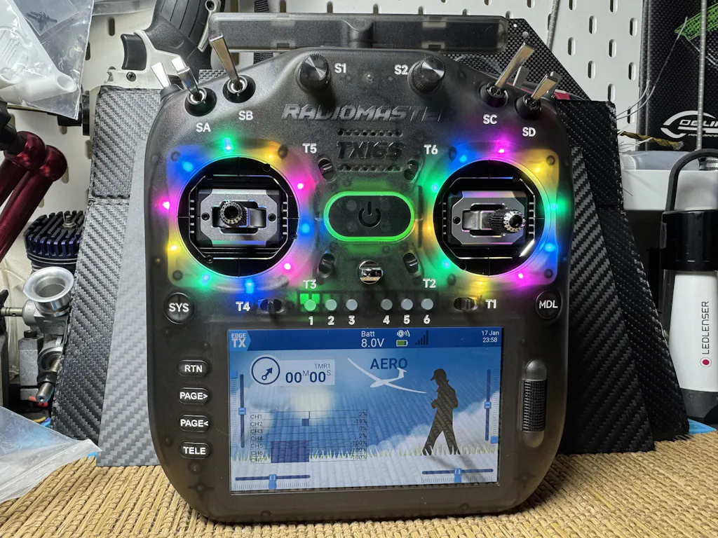 The TX16S MK3 Standard features new V6 quad-bearing Hall-Effect gimbals, using the same high-performance chipset found in the AG02 for improved precision and stability. External adjustments for travel, centering, and tension let you fine-tune the feel exactly to your preference. Programmable LED gimbal light rings add a new layer of customization and function, allowing pilots to assign visual indicators for modes, warnings, or status cues while giving the radio a distinctive, personalized look.